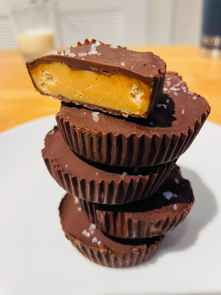 - 2 tsp coconut oil1) Whisk together the peanut butter, coconut oil, raw honey, and vanilla extract until fully combined.2) Add the rice crisps and mix well.3) Line a muffin tin with cupcake liners, then pour the mixture into 12 even liners.4) Freeze for 25 minutes.5) When 25 minutes are up, microwave the chocolate and coconut oil until fully melted.6) Remove the PB cups from the liners, then dip them in the melted chocolate until covered. Immediately put them into a new cupcake liner to make the Reeses shape.7) When they are done, remove them and let them dry on a steel wire rack. Season immediately.8) Freeze for a few extra minutes to solidify. Store extras in the freezer.9) Top with flaky sea salt and enjoy!