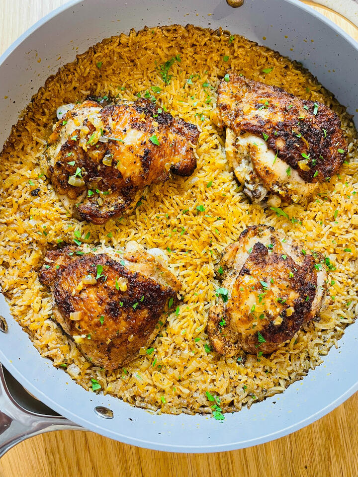 1) Season 4 bone-in chicken thighs with salt, pepper, smoked paprika, garlic powder, and dried parsley.2) Heat some oil over medium heat in an oven-safe pan.3) Brown chicken thighs for about 5-6 minutes on both sides (or until golden brown).4) When the chicken has been browned, remove and set aside.5) Add finely diced garlic (3-4 cloves) and 1/2 yellow onion, and saute until soft, about 2-3 minutes.6) Add 1 cup white rice and toast for 2-3 minutes, stirring well.7) Add 1.5 cups (12oz) chicken bone broth along with a pinch of salt and pepper. Stir well and make sure to scrape any fond off the bottom of the pan at this point.8) Bring to a boil, then place the chicken thighs back in. Cover and bake at 375 degrees for around 25 minutes, or until the rice has absorbed the liquid and the chicken is cooked through.This is absolutely delicious and incredibly easy! Enjoy!