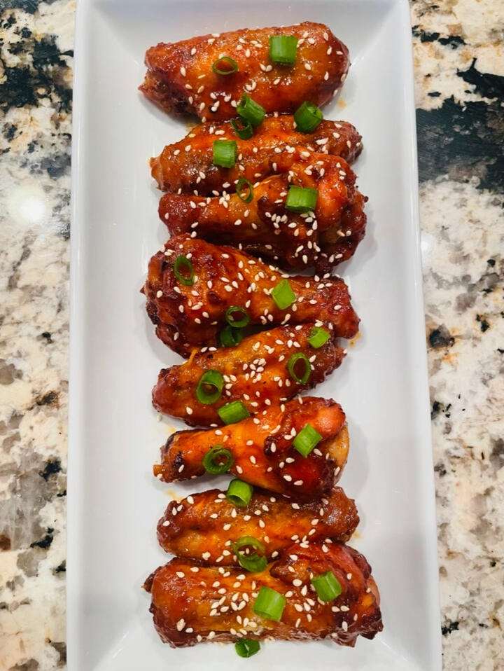 - 1 tbsp rice vinegarWhen the wings are done, toss them in the sauce, top with sesame seeds + green onion, and enjoy!This is enough for 2-3 lb of wings!
