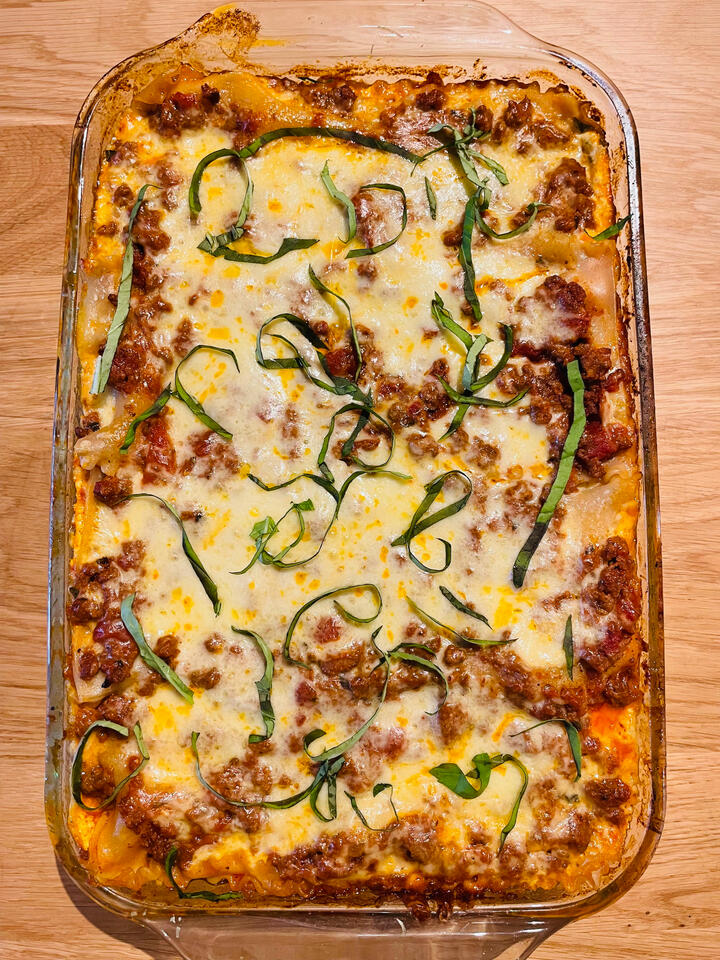 • Salt & pepper1) Start by making your sauce. Simply cook the ground meat until no longer pink, drain the fat, add the jar of tomato sauce, and simmer for 10-15 minutes. Season to taste.2) You can optionally add red pepper flakes, basil, or garlic here if you’d like, but not necessary.3) While that’s simmering, make your ricotta mixture. Mix the egg, ricotta, chopped parsley, salt, and pepper and whisk together until fully emulsified.4) Cook the noodles until al dente; make sure not to overcook them because they will cook more in the oven.5) Now it’s time to assemble the lasagna. In a baking dish, add a very thin layer of meat sauce. Layer the lasagna noodles, ⅓ of the ricotta mixture, parmesan, and a layer of meat sauce. Repeat the layers twice.6) Add a final layer of the remaining noodles, meat sauce, mozzarella, and a cup of parmesan on top.7) Cover with foil then bake at 350 for 45 minutes. Remove the foil. Bake for 15 more minutes.8) Let the lasagna cool for 15-20 minutes before cutting!Enjoy!