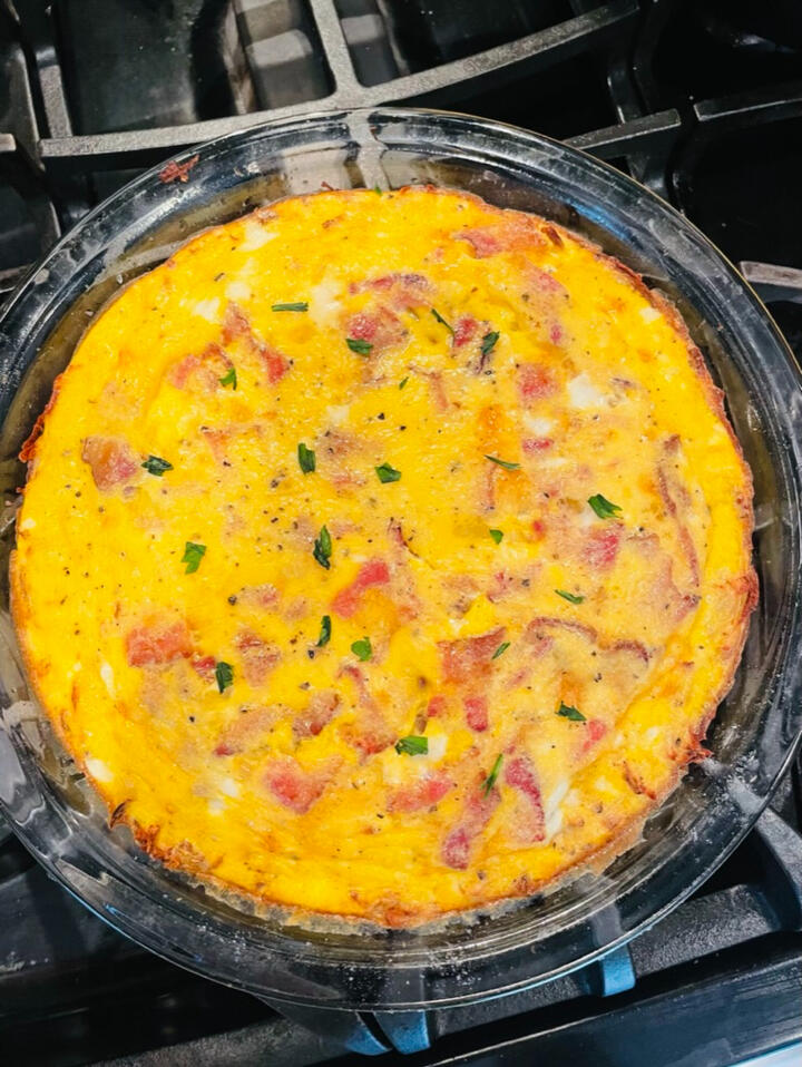 1) Start by cooking some of your protein of choice: bacon, sausage, ground beef, etc.2) Shred a few russet potatoes with a cheese grater, ring the liquid out with a kitchen towel, mold it into a greased dish for the crust, and season with salt and pepper.3) Cook this by itself first for about 20 minutes at 450 to start getting it crispy.4) While this is cooking, scramble 6 eggs, chopped up bacon, a splash of milk, grated parmesan, and salt + pepper5) You can literally add whatever you want here; any vegetables, any kind of cheese, or any meat would work here. You can also use cream or Greek yogurt instead of milk.6) When the crust comes out, knock the oven down to 375, and pour in the egg mixture.7) Bake until cooked through. You’ll know it's done when you can stick a knife through it and no residue sticks to the knife.Some other options to add are spinach & mushrooms, peppers & onions, or whatever you want!