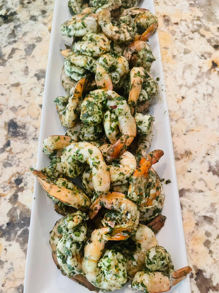 - 1/2 tsp crushed red pepper1) Chop your parsley and garlic very fine, then add everything to a mason jar and shake thoroughly until emulsified.2) Add to a zip lock back along with your shrimp, and marinate for an hour or 2. You can also cook right away if you don’t have time to marinate.3) I prefer to grill these in a grill basket for 1-2 minutes per side, but you can also cook them up on a pan.These are a great protein snack to have in the fridge, for a summer BBQ, or a healthy meal prep. Enjoy!