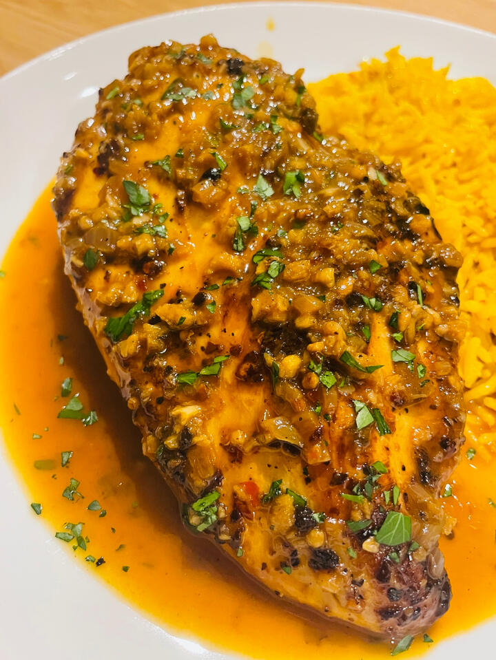 1) Preheat your oven to 400 degrees.2) Start by seasoning your chicken on all sides with salt, pepper, garlic powder, onion powder, oregano, paprika, and cayenne (optional).3) Heat some avocado oil in a large skillet over medium-high heat, and brown your chicken on both sides.4) Your goal here is color; you aren't cooking the chicken all the way through. Around 3-5 minutes per side should leave a nice golden crust. Do this in batches if necessary.5) When your chicken breasts are browned, place them on a baking sheet and cook until they reach 160 degrees internally.6) Once the chicken is in the oven, it is time to make the sauce. Let the pan cool a little and put it over medium heat.Ingredients for sauce: